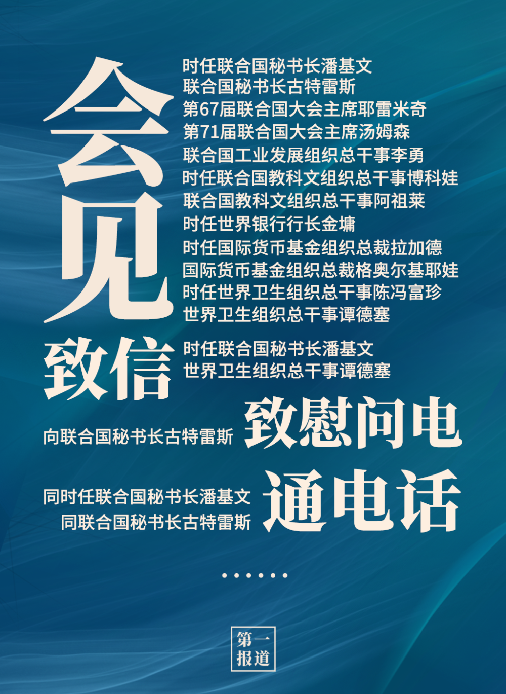2013年以來,習(xí)主席通過會見、通話、致信函等多種方式同聯(lián)合國主要官員保持密切溝通。互動對象包括聯(lián)合國秘書長、聯(lián)合國大會主席,還有聯(lián)合國工業(yè)發(fā)展組織、聯(lián)合國教科文組織、世界銀行、國際貨幣基金組織、世界衛(wèi)生組織等聯(lián)合國專門機構(gòu)主要負責(zé)人。