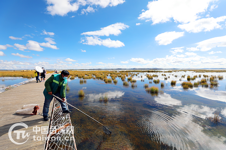 我們見到藏族管護員如科時,他正用長桿連接著漏網,弓腰清理飄在湖中的干枯水草。若爾蓋濕地自然保護區管理局科研科科長索郎奪爾基介紹說,如科的妻子是保護區的清潔員,她這兩天生病,如科在替她清理湖面。
