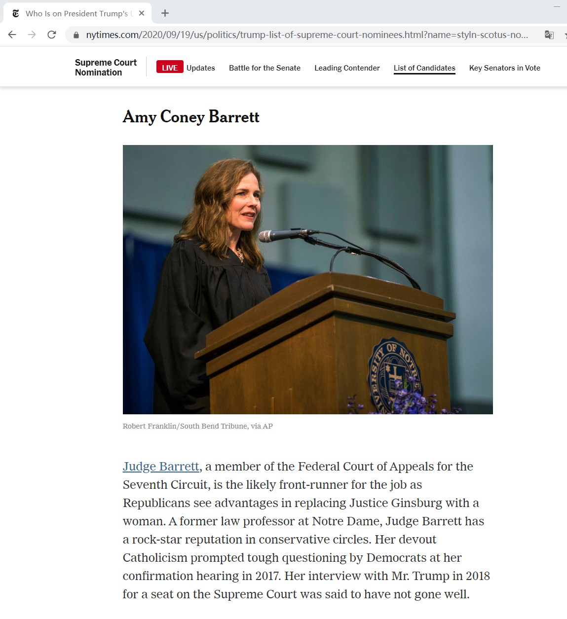 當地時間9月21日,據美國多家媒體報道,美國最高法院大法官魯斯·巴德·金斯伯格去世后,美國總統特朗普目前青睞聯邦第七巡回上訴法院法官艾米·康尼·巴雷特,令其成為金斯伯格繼任者的熱門人選。盡管正式提名尚未出爐,但圍繞最高法院的戰斗已經展開,民主黨人認為特朗普“突擊提名”大法官的做法非常不妥,要求共和黨人遵循他們自己設下的先例,讓贏得大選的人決定提名人選。