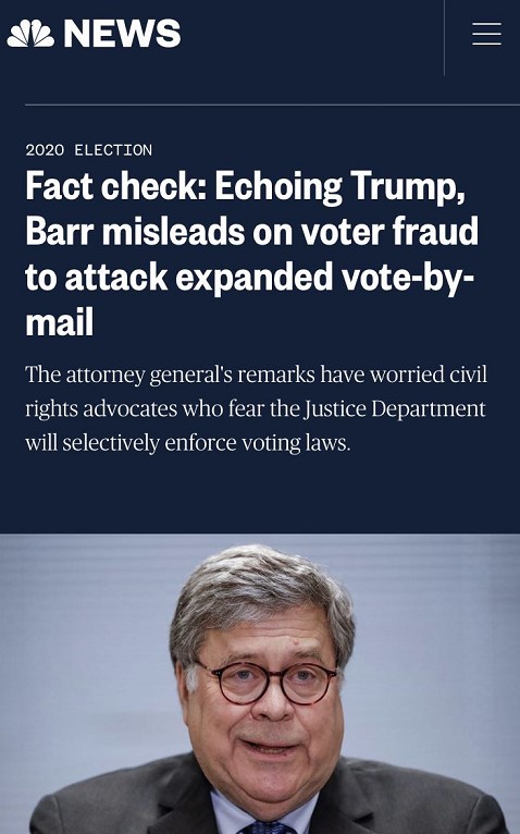 美國全國廣播公司同時指出,美國司法部部長威廉·巴爾一直以來與特朗普一唱一和,已經令人擔心民主的命運,而他就郵寄選票問題更是提出了“一系列誤導性或毫無根據的主張”,破壞了民眾對選舉和法治的信心。報道列舉了巴爾和特朗普二人相互附和的多條謠言,其中包括:美國沒有大面積處理郵寄選票的經驗、郵寄選票會引發大面積選民欺詐、外國勢力介入操控等。