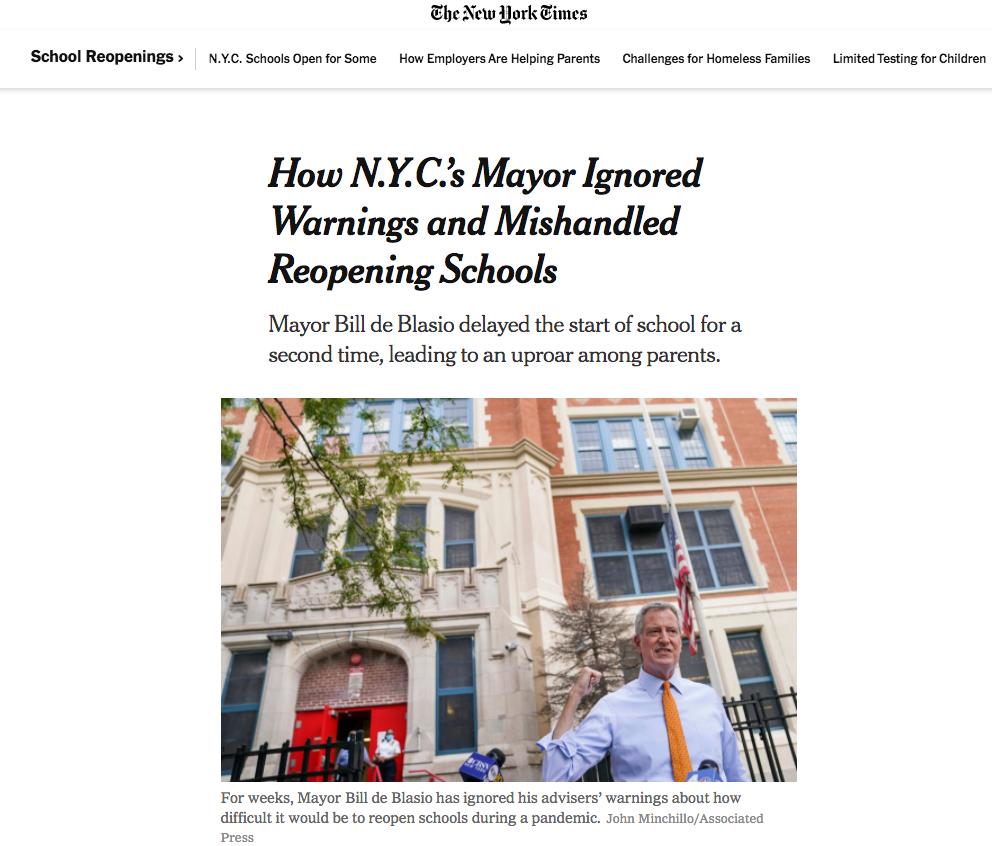 △據(jù)《紐約時(shí)報(bào)》報(bào)道,市長(zhǎng)德布拉西奧無(wú)視警告,強(qiáng)行重啟校園。