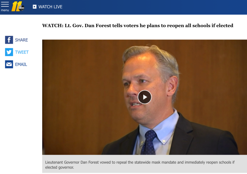 據(jù)美國(guó)廣播公司(ABC NEWS)報(bào)道,北卡羅來(lái)納州副州長(zhǎng)、共和黨派州長(zhǎng)候選人丹·弗雷斯特(Dan Forest)為了在11月的大選中打敗民主黨派候選人羅伊·庫(kù)珀(Roy Cooper)成為新一任州長(zhǎng),告訴選民他計(jì)劃在當(dāng)選后重新開放所有學(xué)校,并在全州范圍內(nèi)廢除口罩強(qiáng)制令。然而對(duì)于疫情中重新開放學(xué)校的風(fēng)險(xiǎn),他卻不愿為學(xué)校提供任何指導(dǎo)意見,也并無(wú)承擔(dān)責(zé)任的態(tài)度。