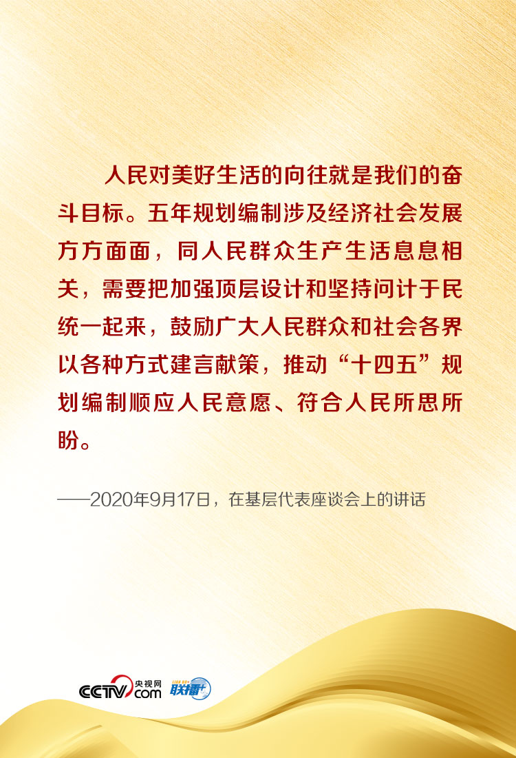 聯播+ “人民對美好生活的向往就是我們的奮斗目標。好的方針政策和發展規劃都應該順應人民意愿、符合人民所思所盼,從群眾中來、到群眾中去。”近一個月以來,習近平總書記多次主持召開各領域專家座談會,開門問策,切實把社會期盼、群眾智慧、專家意見、基層經驗充分吸收到“十四五”規劃編制中來。