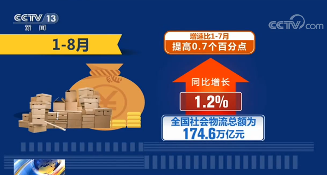 1—8月,全國社會物流總額為174.6萬億元,同比增長1.2%,增速比1—7月提高0.7個百分點。
