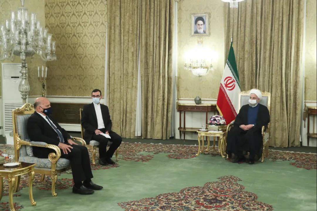 △伊朗總統魯哈尼(右)會晤伊拉克外長福阿德·侯賽因(左)