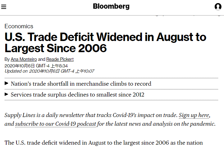 △彭博社報(bào)道:美國(guó)8月貿(mào)易逆差擴(kuò)大至2006年以來(lái)最高水平