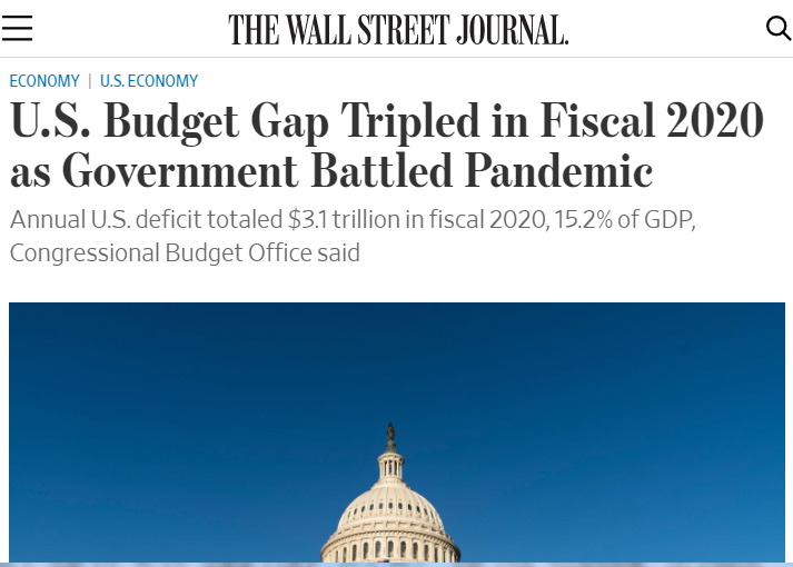 △《華爾街日報》稱,為應對新冠疫情,聯邦政府預算赤字在2020財年達到2019財年的三倍