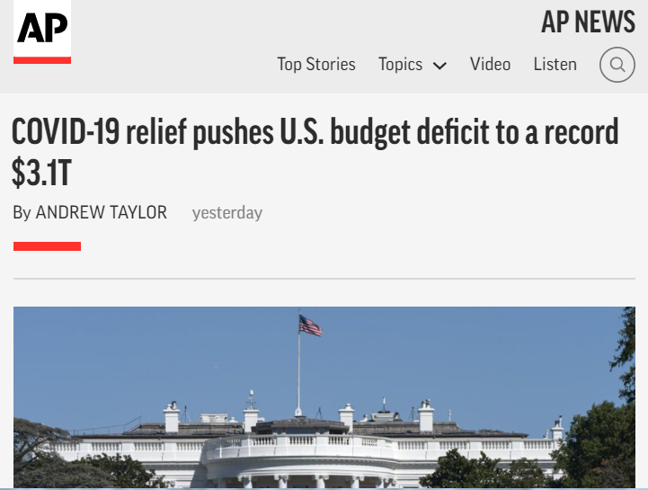 △美聯社稱,疫情救助措施將美國預算赤字推至創紀錄的3.1萬億美元