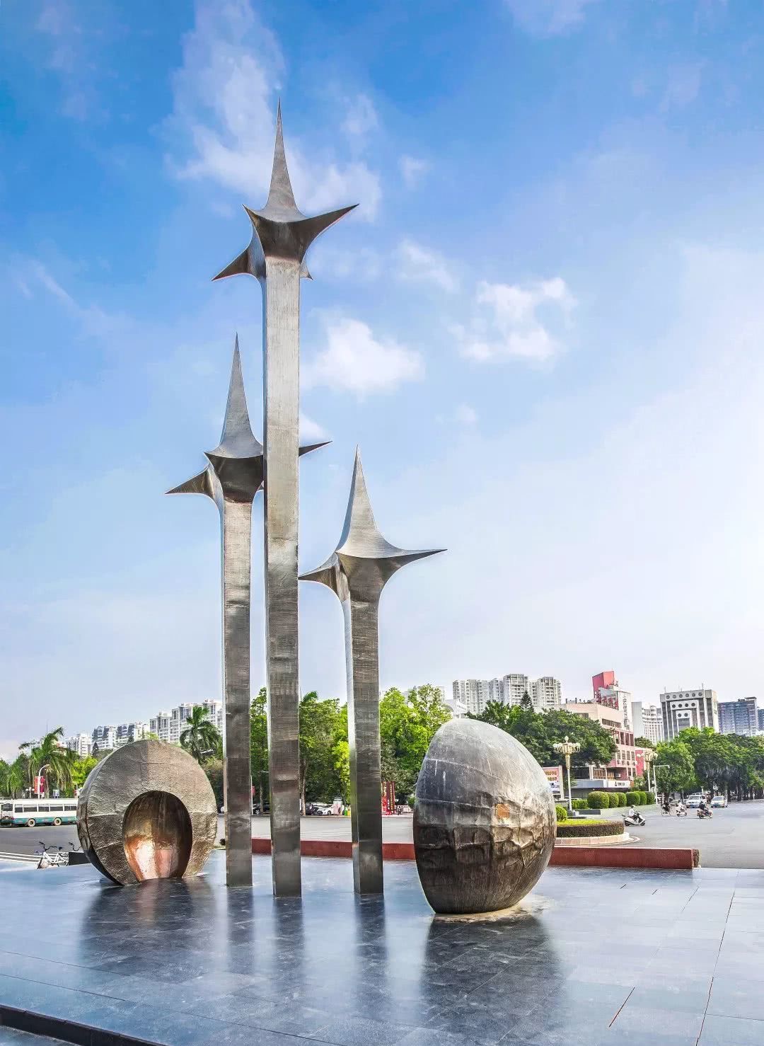 △汕頭的標志性雕塑《升騰》,三根頂部鑲有星星標志的金屬桿錯落有致,高聳挺拔,寓意汕頭發展日日上升。(資料圖)