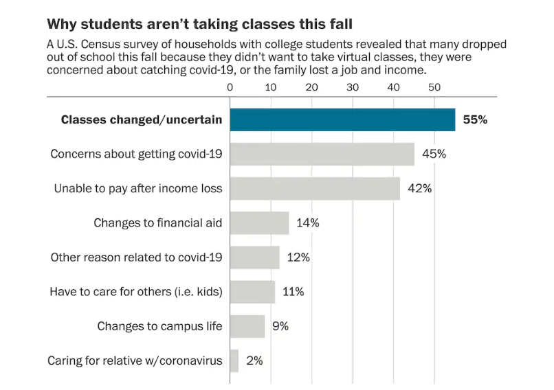 美國人口普查局數據顯示,今年秋季因為經濟原因輟學的學生占42%。