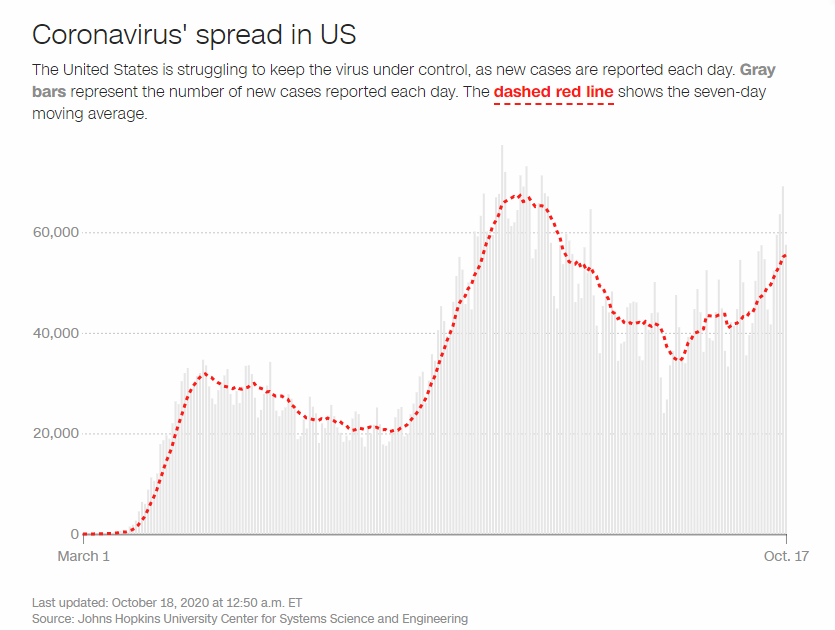 美國消費者新聞與商業頻道(CNBC)對約翰斯·霍普金斯大學收集的數據進行分析發現,本周,美國平均每天新增約5.5萬例新冠肺炎確診病例,與一周前相比增加了16%以上,較9月中旬增加了60%以上。16日,包括科羅拉多、印第安納、明尼蘇達、北卡羅來納等在內的10個州均報告了新冠疫情暴發以來的最高單日新增確診病例數。