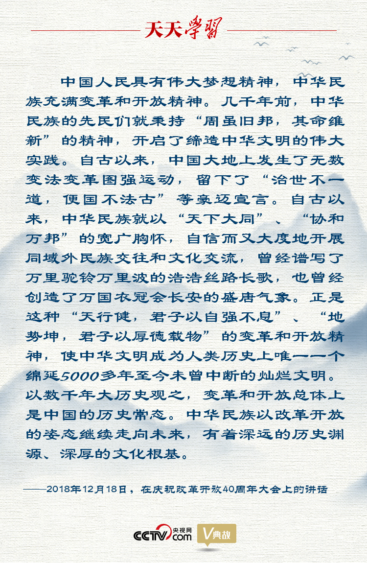 改革創新是時代精神,是民族進步之魂。2018年12月18日,在慶祝改革開放40周年上大會的講話中,習近平總書記回顧了5000多年中華文明史,他引用“治世不一道,便國不必法古”這句閃耀著歷史進化論思想光芒的古語,說明在新時代,中國人民將繼續自強不息、自我革新,中國變革創新的腳步永不停歇。
