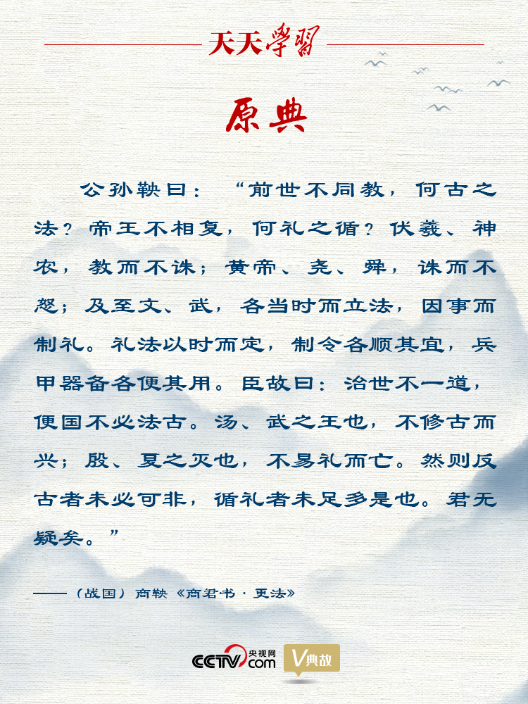 在當時,秦國在戰國七雄中實力最弱,不僅受其他六國輕視,而且被拒之于盟會之外。秦國內部,由于貴族政治和君主的沖突,大權旁落在亂臣之手;在外部,鄰國魏國由于最早變法,國力日強,經常侵奪秦國領土。秦孝公繼位后決心圖強改革,便向社會公開招賢。衛國人商鞅(原名公孫鞅)所獻的改革方略得到秦孝公的稱許,卻遭到舊貴族的強烈反對。他們提出圣人不改變民風民俗就能施行教化,智者不改變舊法就能治理國家,堅持認為“法古無過,循禮無邪”。商鞅針鋒相對地指出,夏、商、周三代的禮制不同,但都成就了王業;春秋五霸的法度也各不相同,但都成就了霸業,必須“不法其故”“不循其禮”,這樣才能夠實現強國富民的目標。他提出了“治世不一道,便國不必法古”的主張,意思是治理國家不一定用一種方略,只要對國家有利就不一定非要效法古代。這堅定了秦孝公改革的決心,由此開始了彪炳史冊的商鞅變法,秦國逐漸走向富強。