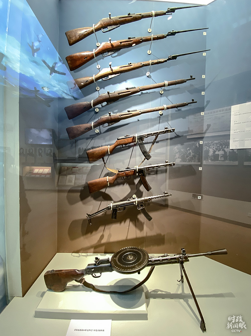 △圖中最下面是捷格加廖夫輕機槍,彈盤裝彈數量多?姑涝瘧饒錾,志愿軍曾使用過這種火力兇猛的蘇式機槍。(總臺央視記者李輝拍攝)