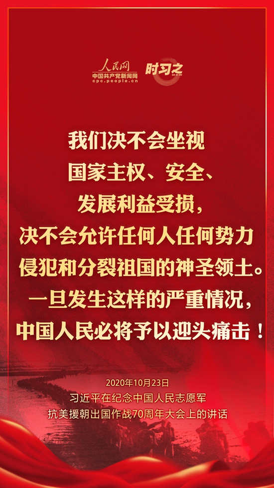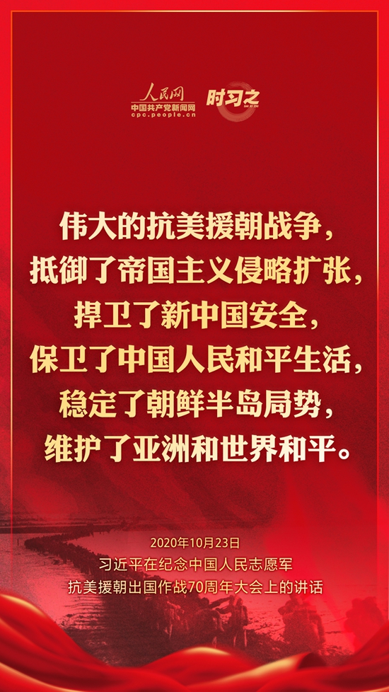 10月23日上午10時,紀念中國人民志愿軍抗美援朝出國作戰70周年大會在北京人民大會堂隆重舉行。中共中央總書記、國家主席、中央軍委主席習近平出席大會并發表重要講話。在講話中,習近平總書記全面回顧總結了抗美援朝戰爭的偉大勝利和巨大貢獻,深刻闡述了抗美援朝精神的歷史意義和時代價值,精辟揭示了抗美援朝戰爭的歷史啟示,鄭重宣示了捍衛國家領土主權和統一、維護地區和世界和平穩定、推動構建人類命運共同體的堅定立場和決心,強調要銘記偉大勝利,敢于斗爭、善于斗爭,把中國特色社會主義偉大事業不斷推向前進。人民網·中國共產黨新聞網“時習之”欄目制作了12張海報,帶您一起回顧總書記鏗鏘有力的話語。