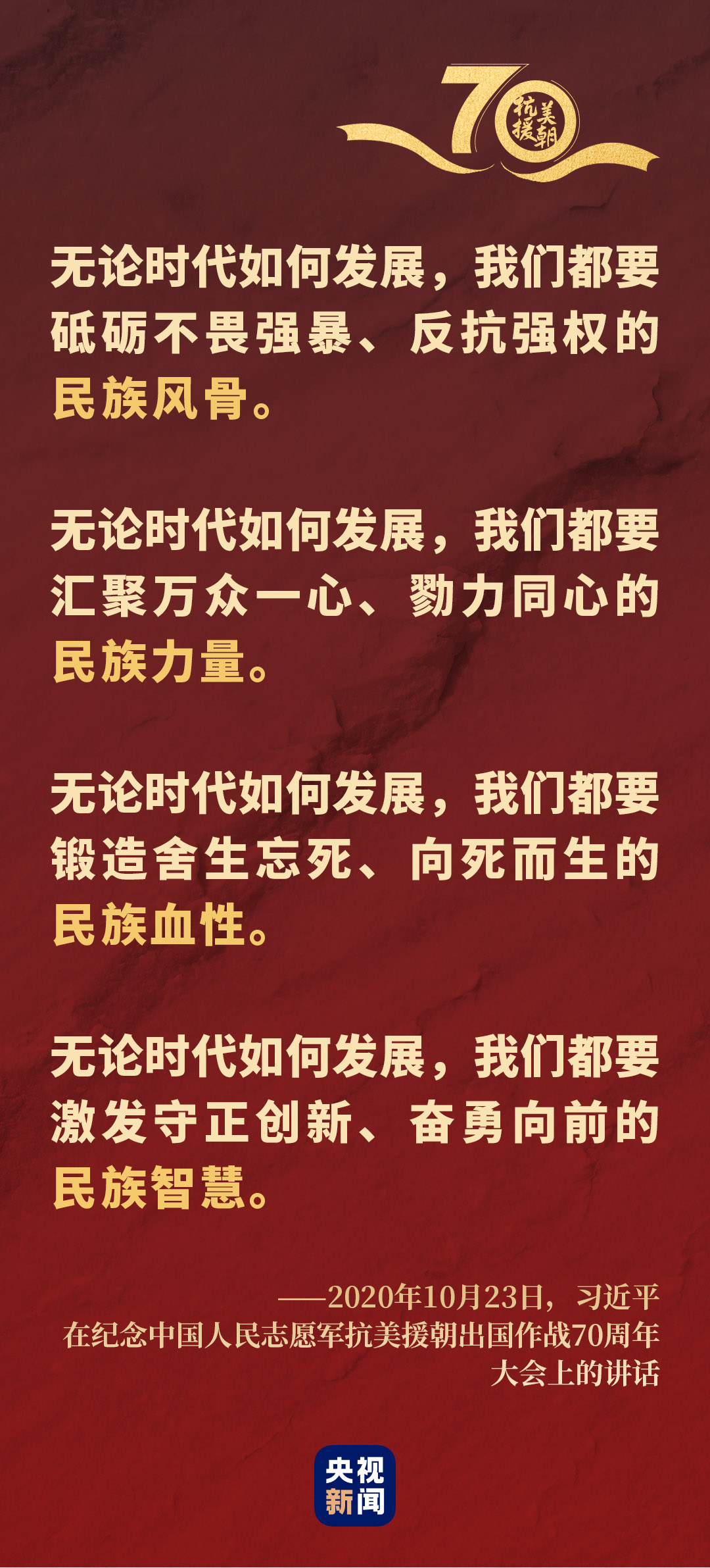 “偉大抗美援朝精神跨越時空、歷久彌新,必須永續傳承、世代發揚。”10月23日,在紀念中國人民志愿軍抗美援朝出國作戰70周年大會上,習近平這樣闡述。