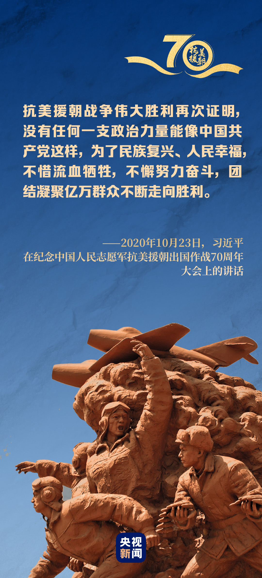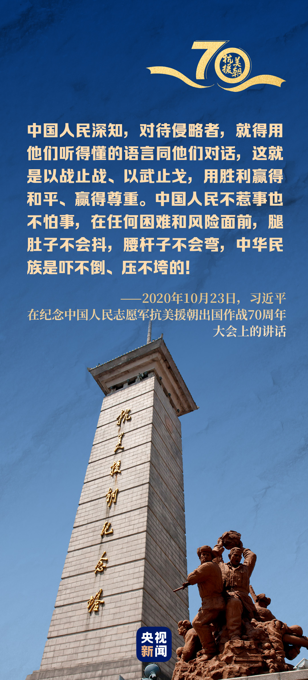 “1950年10月19日,中國人民志愿軍在彭德懷司令員兼政治委員率領下進入朝鮮戰場。這是以正義之師行正義之舉。”“偉大的抗美援朝戰爭,抵御了帝國主義侵略擴張,捍衛了新中國安全,保衛了中國人民和平生活,穩定了朝鮮半島局勢,維護了亞洲和世界和平。”在講話中,習近平充分肯定中國人民志愿軍建立的不朽歷史功勛。