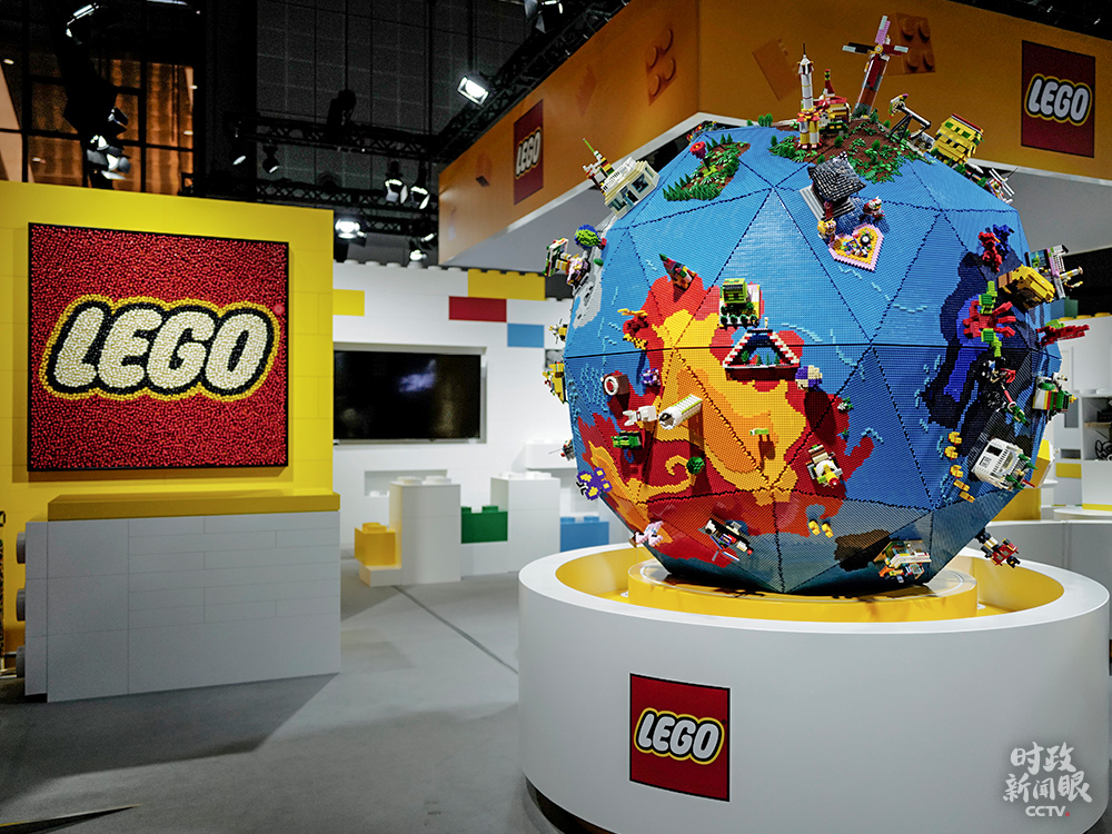△這是進博會消費品展區的“樂造星球”展品,高2.7米(含底座),共包含62750塊樂高積木顆粒,顆粒總重量達106千克。(總臺國廣記者李晉拍攝)