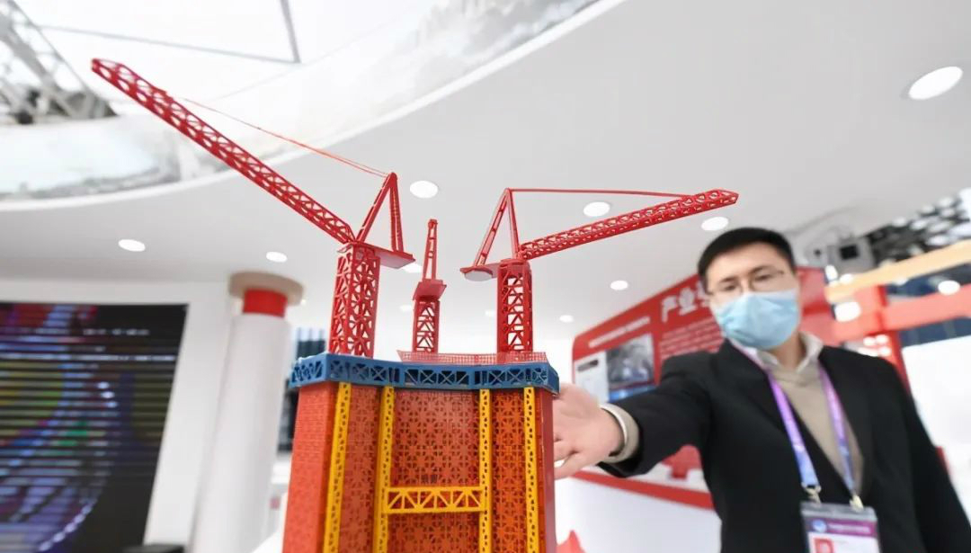 △第三屆進博會上展出的“空中造樓機”不僅較傳統施工裝備更加安全智能,還可縮短20%的工期。