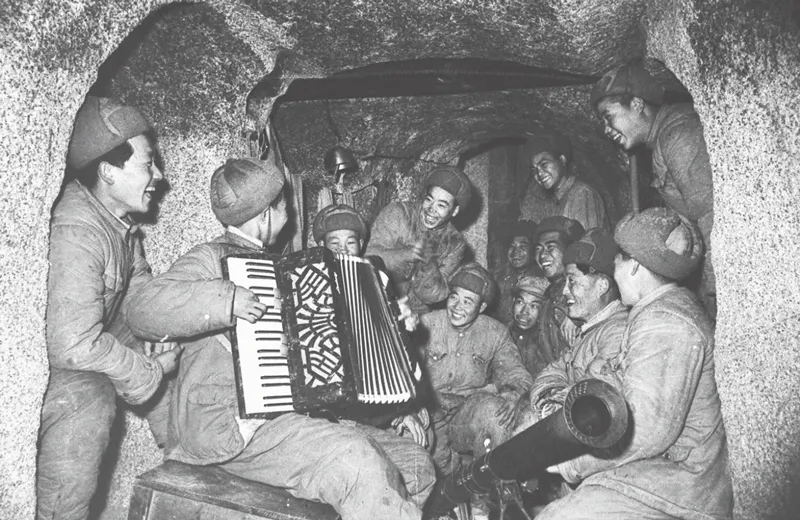 在朝鮮前線,雖然戰(zhàn)斗激烈,生活艱苦,但中國人民志愿軍戰(zhàn)士始終保持著革命樂觀主義精神。圖為戰(zhàn)斗間隙,志愿軍戰(zhàn)士歌聲、笑聲不斷。新華社發(fā) 葛力群/攝