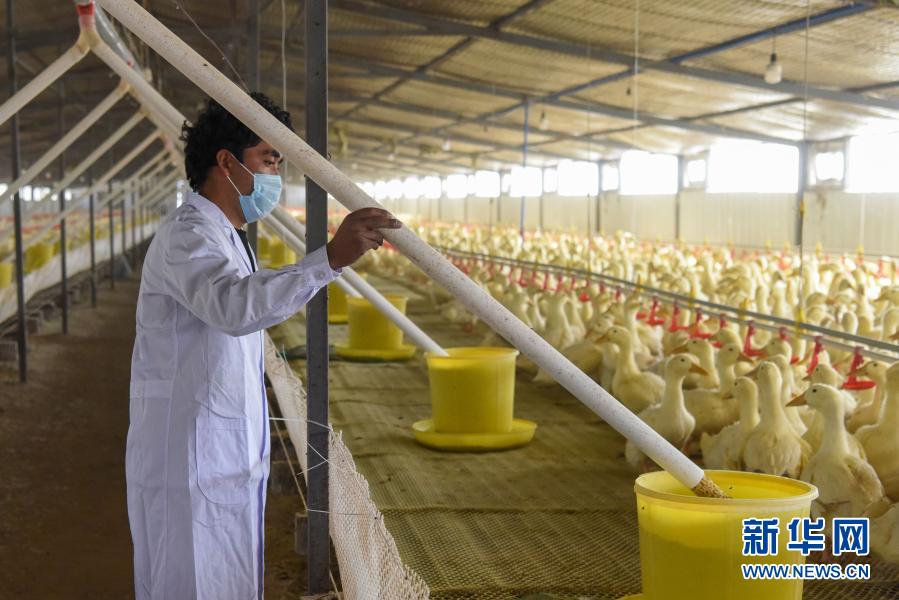 在洛浦縣山普魯鎮(zhèn)博斯坦庫勒村的奮斗家禽養(yǎng)殖農(nóng)民專業(yè)合作社,“嘎嘎”的鴨叫聲此起彼伏。25歲的“鴨保姆”阿布來提·熱杰普忙著給鴨子補(bǔ)充飼料。作為建檔立卡貧困戶,此前務(wù)農(nóng)的他去年9月來到合作社,在專業(yè)人員的培訓(xùn)下很快上手,如今月收入近3000元。