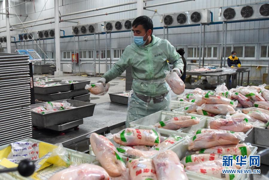 在新疆和田地區(qū)洛浦縣北京工業(yè)園區(qū)內(nèi)的利田香農(nóng)食品有限公司,工人將包裝好的鴨產(chǎn)品稱重(11月7日攝)。新華社記者 丁磊 攝