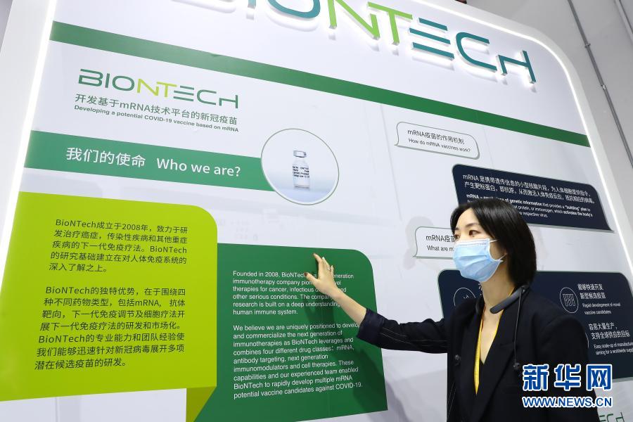 11月5日,在第三屆中國(guó)國(guó)際進(jìn)口博覽會(huì)上,工作人員在醫(yī)療器械及醫(yī)藥健康展區(qū)介紹由復(fù)星醫(yī)藥與德國(guó)拜恩泰科合作開發(fā)的新冠病毒mRNA(信使核糖核酸)疫苗。新華社記者 張玉薇 攝