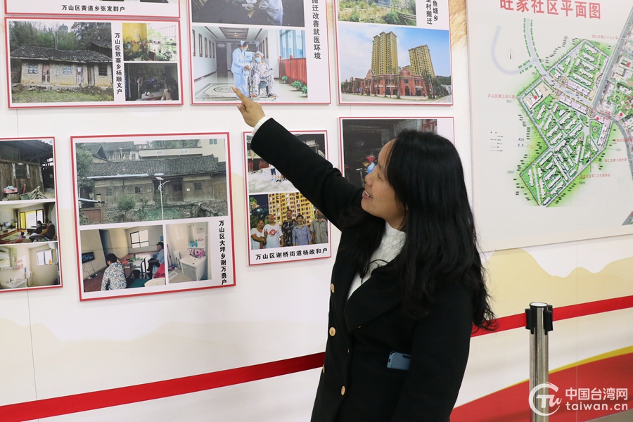 旺家社區(qū)黨總支部副書(shū)記何英向記者介紹萬(wàn)山區(qū)易地扶貧搬遷后,當(dāng)?shù)卮迕窬幼l件的變化。(中國(guó)臺(tái)灣網(wǎng) 尹賽楠 攝)