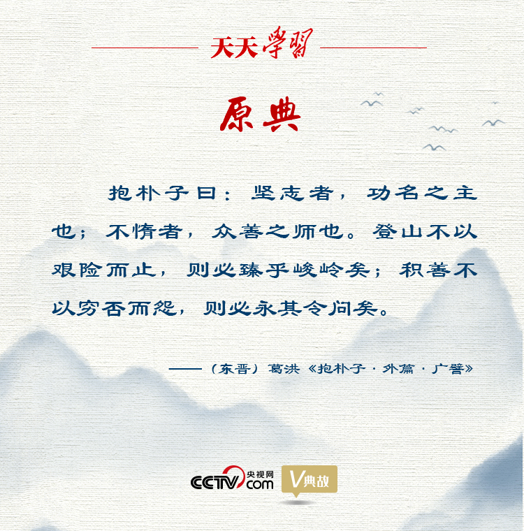 在《外篇·廣譬》中,葛洪提出:“堅志者,功名之主也;不惰者,眾善之師也。登山不以艱險而止,則必臻乎峻嶺矣;積善不以窮否而怨,則必永其令問矣!币馑际且庵緢远,是建功立業的主導;勤奮不怠,是一切善行的老師。登山不因為艱難險阻而停止,就一定會到達頂峰;行善不因為自身窮困與否而埋怨,就一定會使自己的美譽長久。用登山作譬,指出意志堅定和勤奮不怠是事業成功的重要保證。