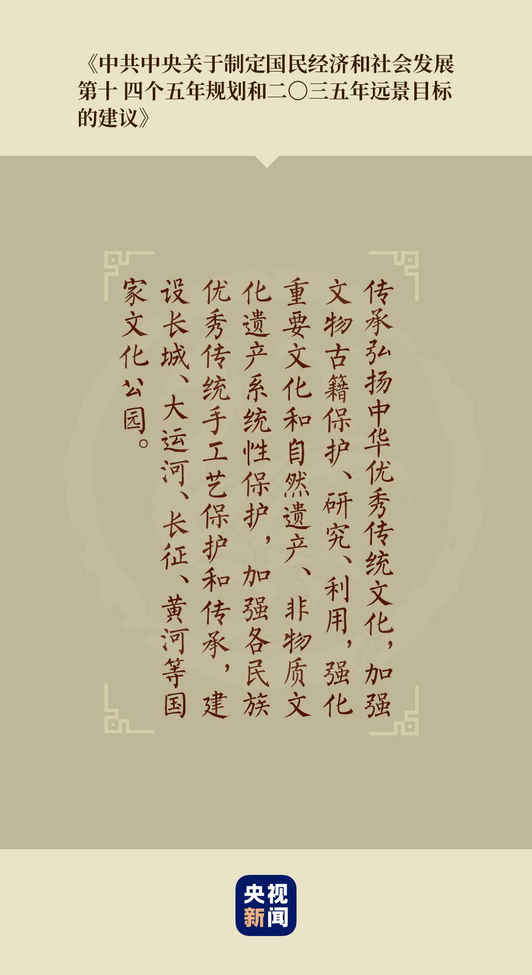 黨的十九屆五中全會審議通過的《中共中央關于制定國民經濟和社會發展第十四個五年規劃和二〇三五年遠景目標的建議》,提出“繁榮發展文化事業和文化產業,提高國家文化軟實力”的目標任務。