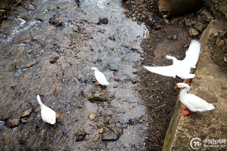 谷莫村內(nèi),幾只白鵝飛入河內(nèi)。(中國臺(tái)灣網(wǎng) 尹賽楠 攝)