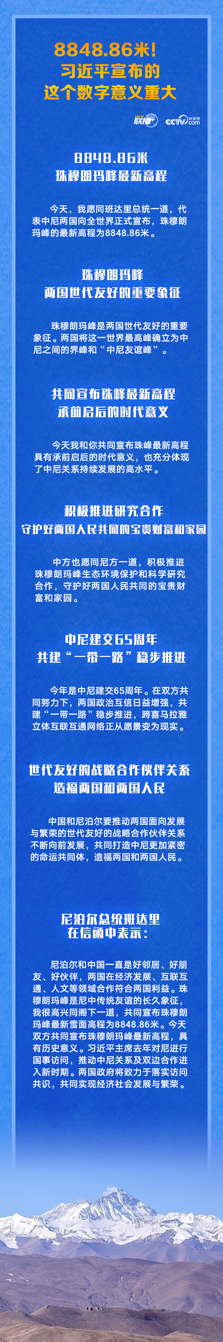 習近平主席指出,去年,我們就中國和尼泊爾共同宣布珠穆朗瑪峰最新高程達成共識。一年多來,兩國團隊克服種種困難,扎實開展工作,最終確定了基于全球高程基準的珠穆朗瑪峰雪面高程。