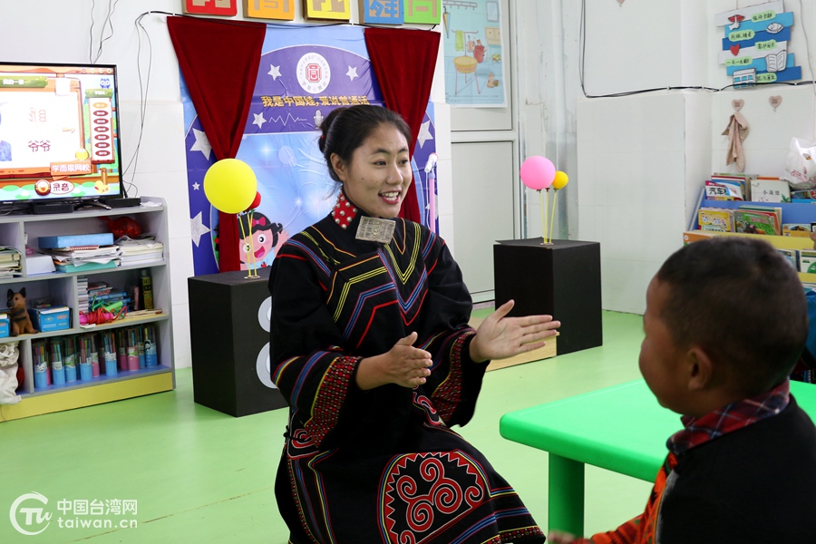 灑拉地坡鄉(xiāng)幼兒園教師羅英與孩子們互動。(中國臺灣網(wǎng) 尹賽楠 攝)