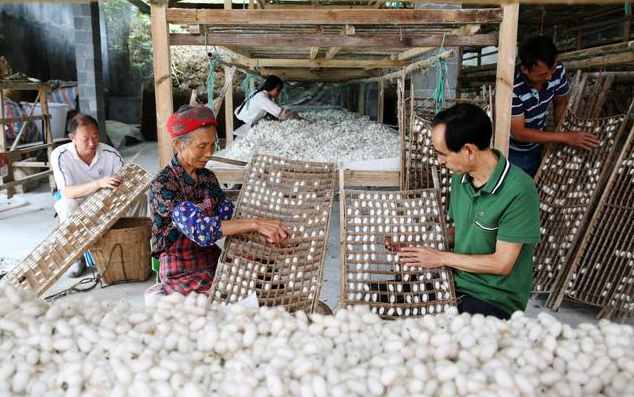△2020年9月11日,重慶市黔江區杉嶺鄉林峰社區第一書記杜建(前右)和村民一起采摘蠶繭。