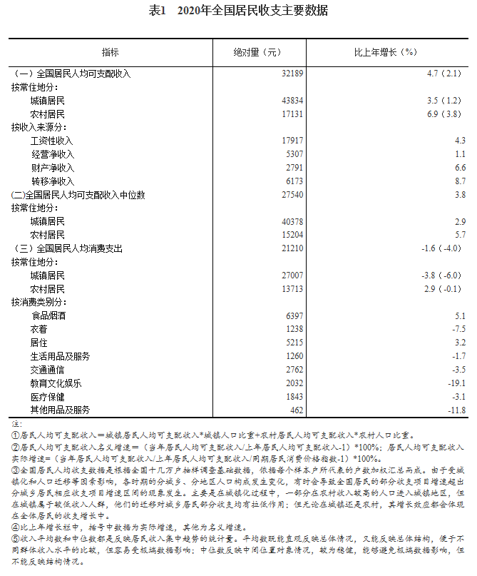 統(tǒng)計局:2020年全國居民人均可支配收入32189元 實際增長2.1%
