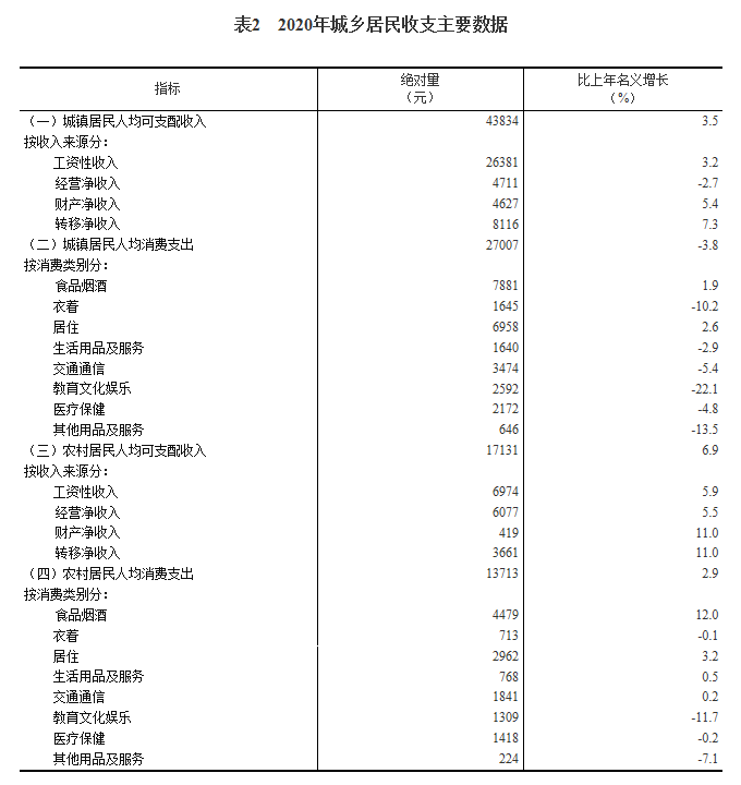 2020年,全國居民人均可支配收入32189元,比上年名義增長4.7%,扣除價格因素,實際增長2.1%。其中,城鎮(zhèn)居民人均可支配收入43834元,增長(以下如無特別說明,均為同比名義增速)3.5%,扣除價格因素,實際增長1.2%;農(nóng)村居民人均可支配收入17131元,增長6.9%,扣除價格因素,實際增長3.8%。