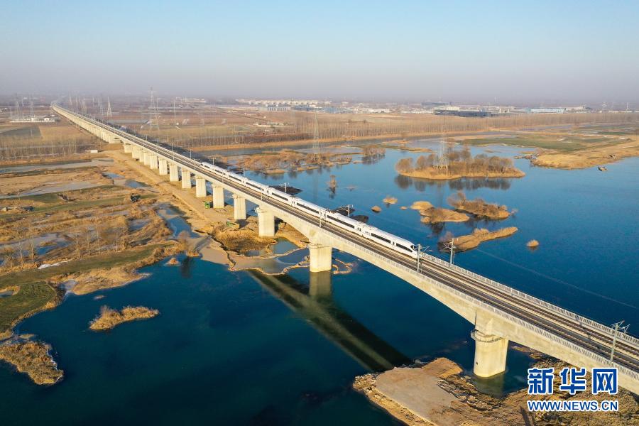 運(yùn)行試驗(yàn)動(dòng)車組列車通過徐連高鐵沂河特大橋(2021年1月8日攝,無人機(jī)照片)。徐連高鐵位于江蘇省北部黃淮平原地區(qū),西起徐州市,東至連云港市,正線全長約180公里。新華社記者 季春鵬 攝