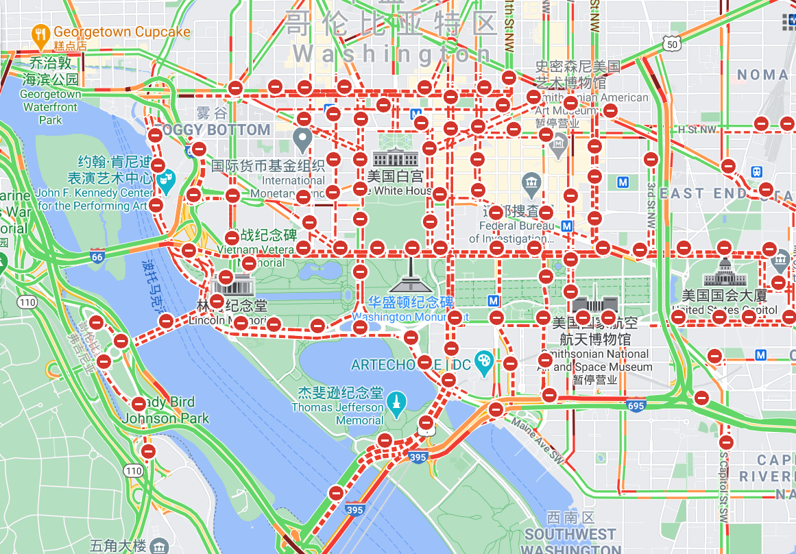 △谷歌地圖顯示的華盛頓市區(qū)限行路況