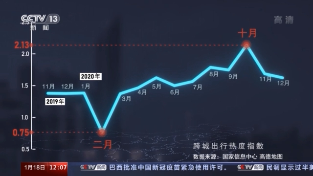 國家信息中心根據(jù)用戶出行的位置變化信息,測算出了這張反映人們跨城出行熱度的曲線,經(jīng)歷了2月的“低谷”,一路上揚,在10月,迎來最高點。