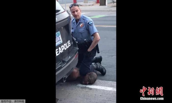 當地時間5月25日,美國明尼蘇達州明尼阿波利斯市一名警察在逮捕非裔男子喬治·弗洛伊德時,將其按在地上,用膝蓋頂住脖子。(視頻截圖)