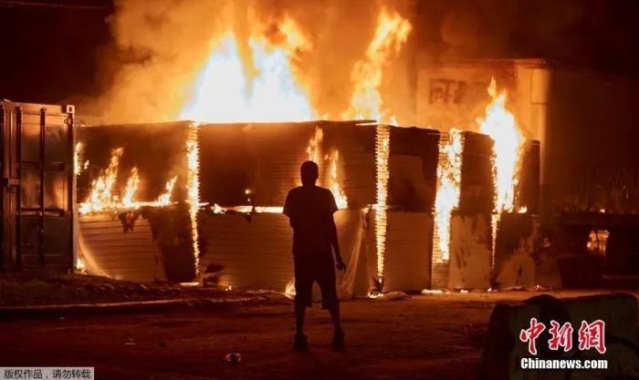 資料圖:弗洛伊德之死引發了大規?棺h,有暴徒趁機縱火和搶劫。圖為抗議者在明尼阿波利斯市第三警察局附近燒毀一處建筑設施。