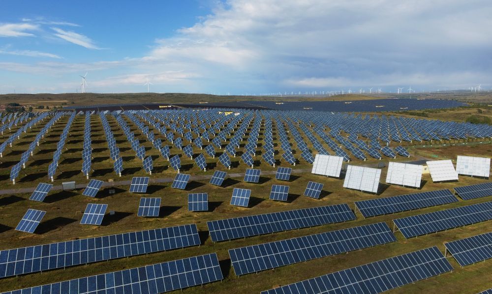 張家口市張北縣大河鄉(xiāng)國(guó)家風(fēng)光儲(chǔ)輸示范基地的光伏發(fā)電站和風(fēng)電場(chǎng)遙相呼應(yīng)(9月15日無人機(jī)拍攝)。新華社記者楊世堯攝