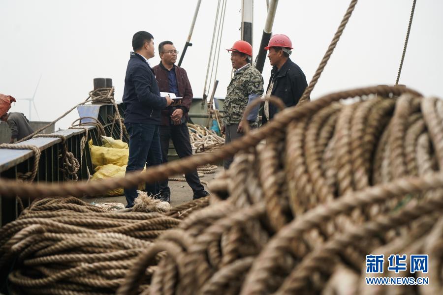 2020年10月21日,江蘇省海安市濱海新區紀工委干部(左一、左二)向漁船負責人詢問惠漁油補發放情況。 新華社記者 季春鵬 攝