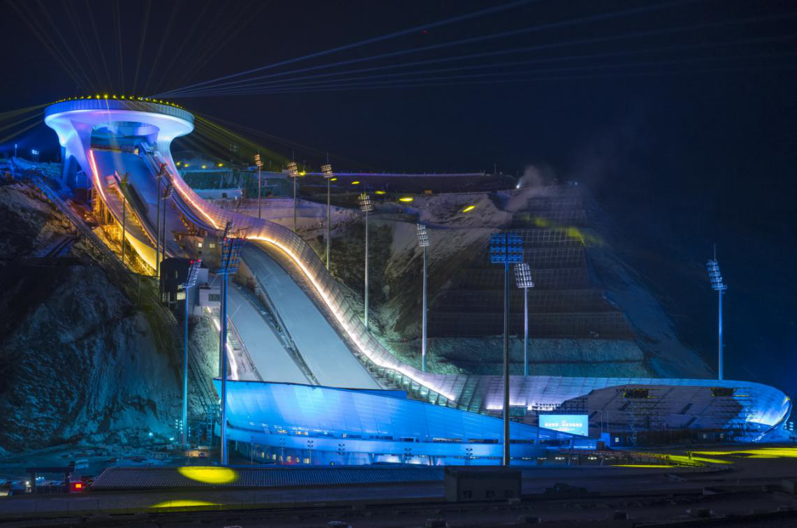 這是位于河北省張家口市崇禮區(qū)的國家跳臺滑雪中心“雪如意”點亮效果。無人機照片,2020年12月19日攝