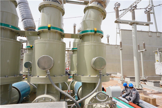 這是2019年5月8日,工人在位于河北省張家口市康保縣姚家灘村的康保換流站施工。張北可再生能源柔性直流電網示范工程實現新能源大功率輸出,增加北京新能源電力消費,滿足冬奧會低碳綠色用電需要。新華社記者 楊世堯 攝