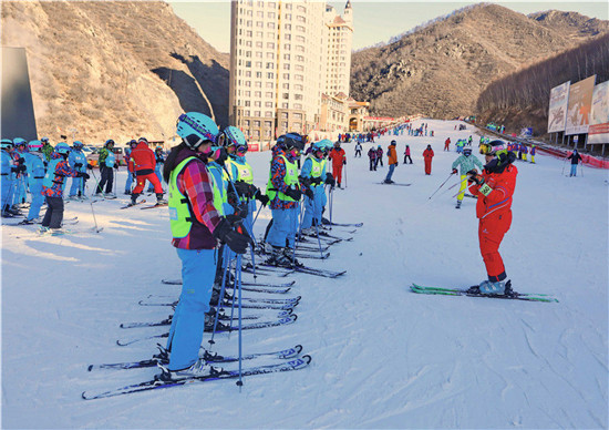 這是2019年1月7日,一名教練在張家口市崇禮區萬龍滑雪場給學員講解滑雪技巧。新華社記者 楊世堯 攝