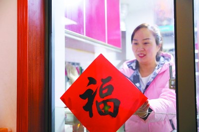 新春佳節臨近,安徽省合肥市濱湖世紀社區開展“翰墨飄香迎新春”主題活動,來自社區的書法愛好者現場書寫春聯并送到留在合肥過年的外來務工人員家中。圖為1月27日,安徽六安籍濱湖世紀社區居民張德梅在家中貼福字,今年她全家留在合肥過年。 新華社記者 曹力攝