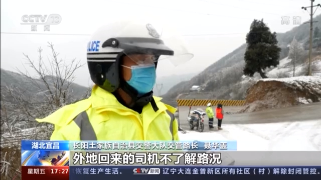 長陽土家族自治縣交警大隊交管“路長” 聶華蓋:這種環形路口的話在我們村里特別多,有的還是新路,路況特別復雜,外地回來的司機不了解路況,積雪太厚爬不上去,我們就可以協助他把防滑鏈裝好以后再走,萬一爬不上去就指條新路讓他繼續走。
