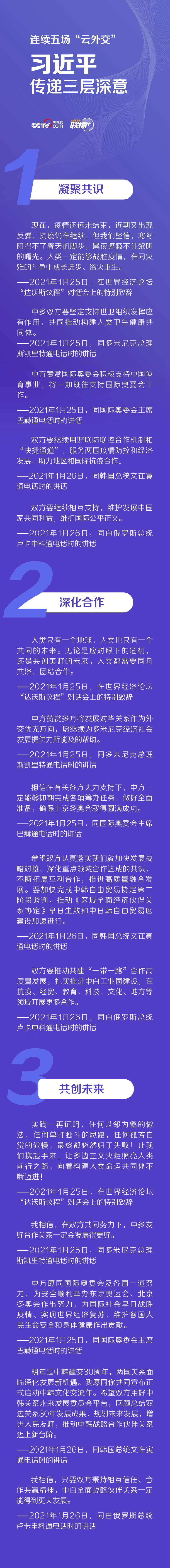 聯播+1月25日以來,習近平主席再次開啟繁忙的“云外交”模式,先后在北京以視頻方式出席世界經濟論壇“達沃斯議程”對話會,同多米尼克總理斯凱里特、國際奧委會主席巴赫、韓國總統文在寅、白俄羅斯總統盧卡申科通電話。