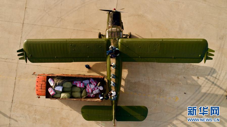 空軍某運輸搜救團官兵與當(dāng)?shù)厝罕娒芮信浜涎b載種子(2020年6月7日攝)。)新華社發(fā)(丁少軒 攝)